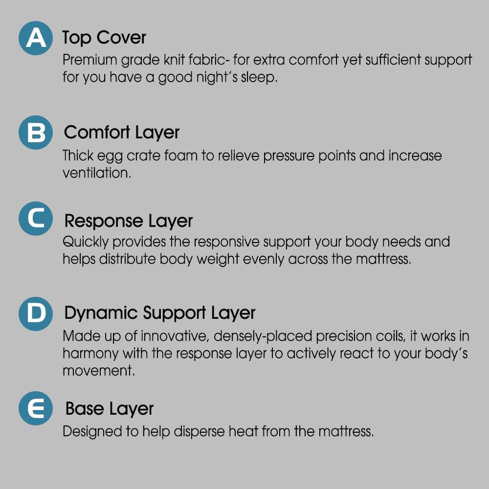 - Dynamic Support Layer: Made up of innovative, densely-placed precision coils, it works in harmony with the response layer to actively react to your body’s movement.